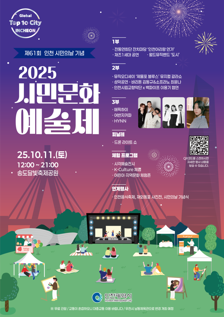 ‘2025 시민문화예술제’는 시민 누구나 참여할 수 있는 무료 축제로, 자세한 내용은 누리집(https://incheonfestival.co.kr/)을 통해 확인할 수 있다.