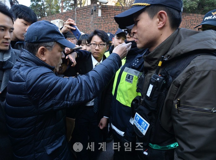 박근혜 전 대통령 측 법률대리인 김평우 변호사가 14일 오전 서울 삼성동 박 전 대통령 사저를 찾은 가운데 경찰이 이를 제지하고 있다. 2017.03.14.