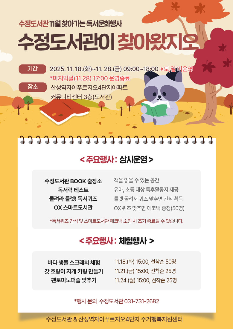 먼저 18일부터 28일까지 산성역자이푸르지오4단지아파트 내 작은도서관(커뮤니티센터 3층 위치)에서 ‘수정도서관이 찾아왔지오’ 행사를 운영한다.