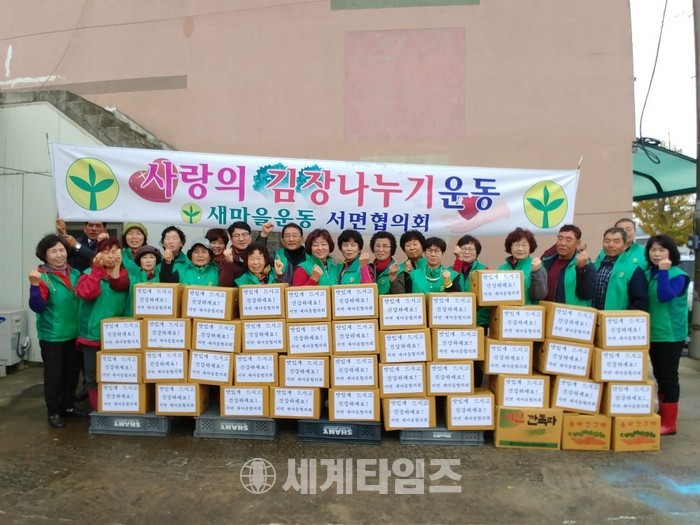[서천=세계타임즈 이영애 기자]서천군 서면새마을협의회(회장 유진웅)와 서면 부녀회(회장 김순희)는 지난 22일 회원 30여 명이 참여하여 배추 300포기(40박스)를 김장해 관내 노인회관 및 저소득가정, 독거노인 등 40세대에 전달하는 “사랑의 김장 나눔 행사”를 가졌다.