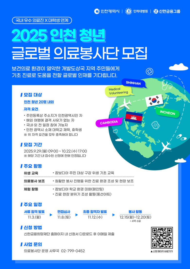 봉사단은 인천 청년 20명을 선발해 오는 12월 15일부터 12월 20일까지 4박 6일간 캄보디아 깜뽓주(Kampot)에 파견된다. 참가자들은 인하대병원 의료진과 함께 진료 보조와 지역 환경 개선 활동에 참여하며, 왕복 항공료와 숙박·식비 등 체재비, 안전교육 등이 지원된다.