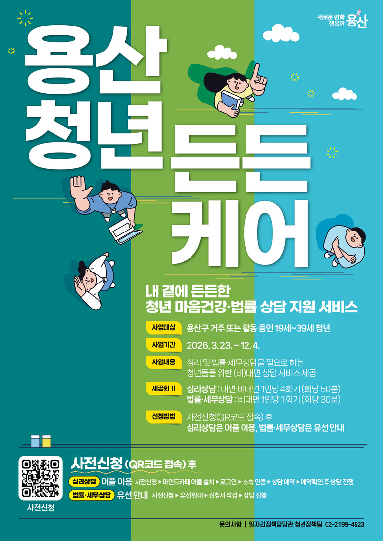 용산구는 19세부터 39세까지 지역 내 거주하거나 활동하는 청년을 대상으로 심리상담과 법률·세무 상담을 제공하는 ‘2026 용산 청년 든든케어’ 사업을 본격 추진한다고 밝혔다. 취업, 직무 스트레스, 대인관계 등 다양한 문제로 어려움을 겪는 청년들에게 실질적인 도움을 제공하기 위한 취지다.