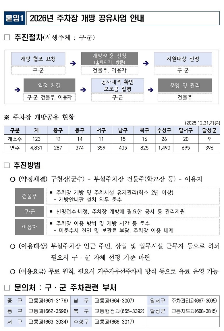 대구시는 2019년부터 본 사업을 꾸준히 추진해 왔으며, 2025년 12월 말 기준으로 총 123개소, 4,831면의 주차장을 개방·운영 중이다. 이를 통해 주택가 밀집 지역과 상업지역 인근의 야간 주차 불편이 완화되는 등 시민 체감 효과도 나타나고 있다.