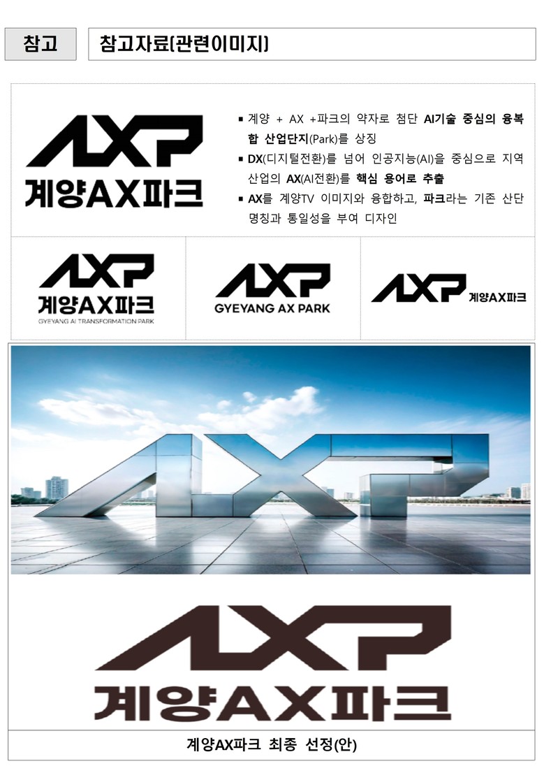 ‘계양AX파크’는 계양 + AX + 파크(Park)의 약자로 디지털 전환(DX)을 넘어 인공지능(AI)을 중심으로 지역산업의 AX(AI전환)를 핵심용어로 추출하고 AX를 계양테크노밸리 이미지와 융합하고, 파크(Park)라는 단어를 더해 첨단산업이 융합되는 친환경 산업단지의 의미를 담았다.