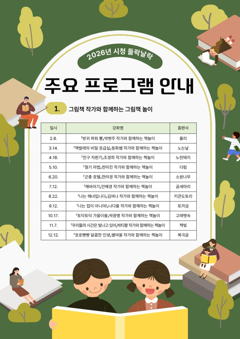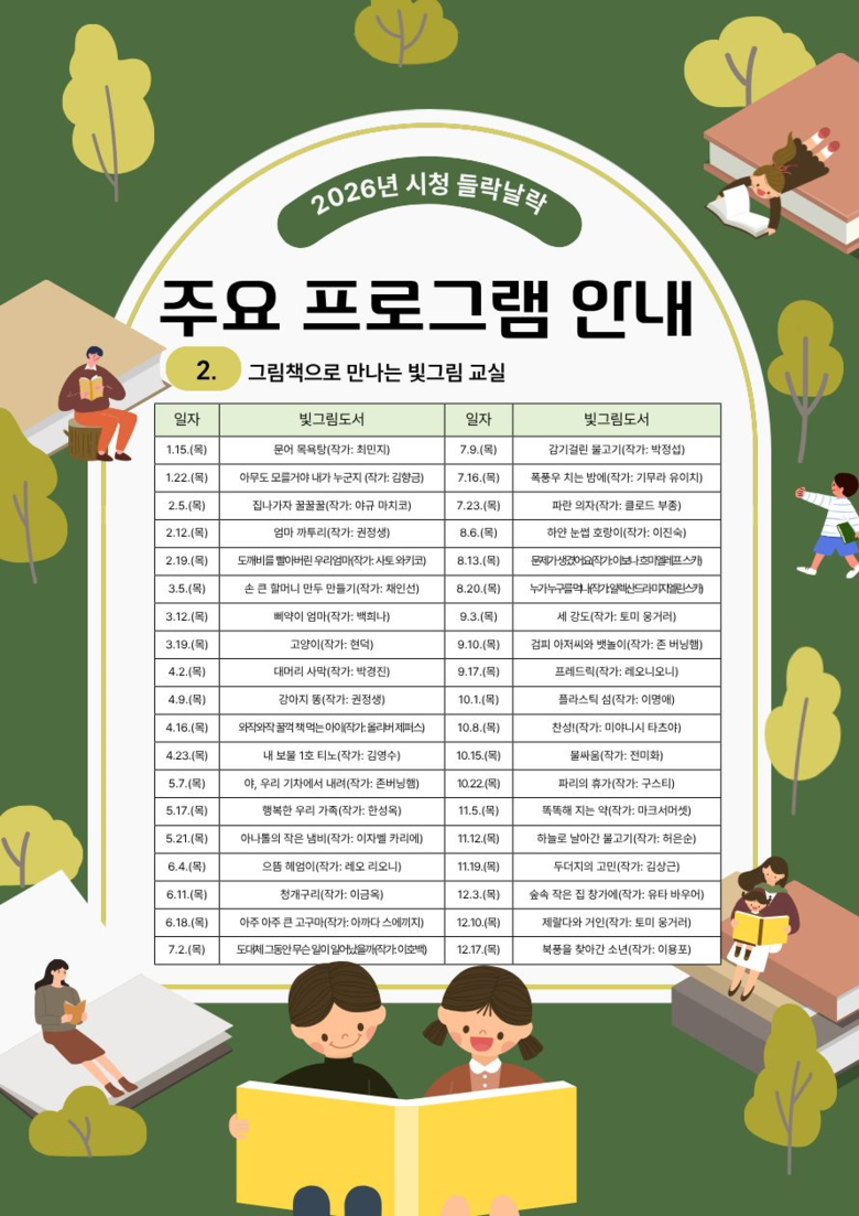 2026년 시청 들락날락 운영 프로그램은 ▲그림책 작가와 함께하는 그림책 놀이 ▲빛그림 교실 ▲하늘정원 프로그램 등 30여 종이다.
