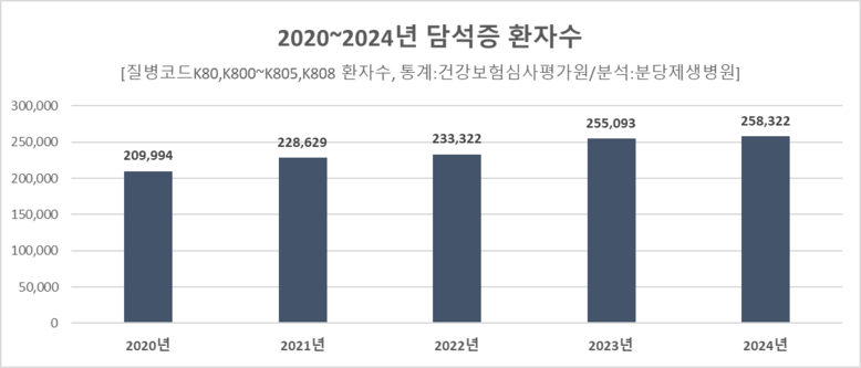 분당제생병원이 최근 5년간 담석증 환자수를 분석한 결과 지난 2020년에는 209,994명이었으나 2024년에는 258,322명으로 최근 5년사이 23%증가했다.