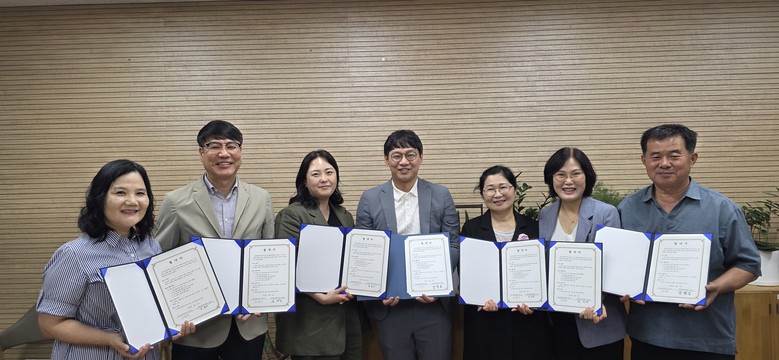 | ▲ 광주효동초등학교는 지난 17일 본교에서 5개 지역돌봄기관과 협약을 체결했다. 왼쪽부터 서머힐 북구지역아동센터 김성미 센터장, 방과후협회 김재일 이사장, 1318희망지기지역아동센터 진선미 센터장, 광주효동초등학교 강택구 교장, 중흥다함께돌봄센터 김소연 센터장, 벧엘지역아동센터 문순희 센터장, 중흥지역아동센터 강명심 센터장. |