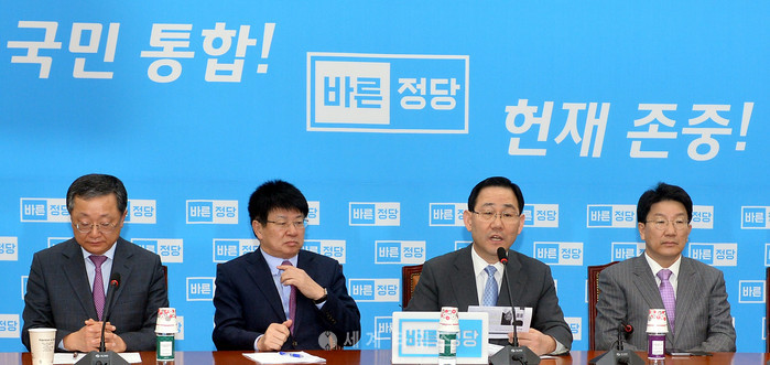 주호영(오른쪽 두 번째) 바른정당 대표권한대행 겸 원내대표가 14일 오전 서울 여의도 국회에서 열린 원내대책회의에서 발언하고 있다. 왼쪽부터 김재경 의원, 이종구 정책위의장, 주호영 당대표 권한대행 겸 원내대표, 권성동 의원. 2017.03.14.