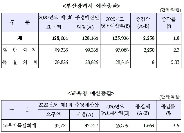 추경예산안은 부산시가 당초예산 12조 5,906억원 대비 1.8% 늘어난 12조 8,164억원이며 교육청은 4조 6,059억원 대비 3.6% 늘어난 4조 7,722억원 규모다.