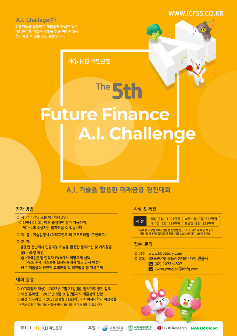 2019년에 시작된 ‘Future Finance A.I. Challenge’는 인공지능을 활용한 미래금융 아이디어를 확보하고 우수인재들의 금융 인공지능에 관심을 높이고자 마련됐다. 금융감독원·이화여자대학교·네이버클라우드·LG AI연구원이 후원한다.