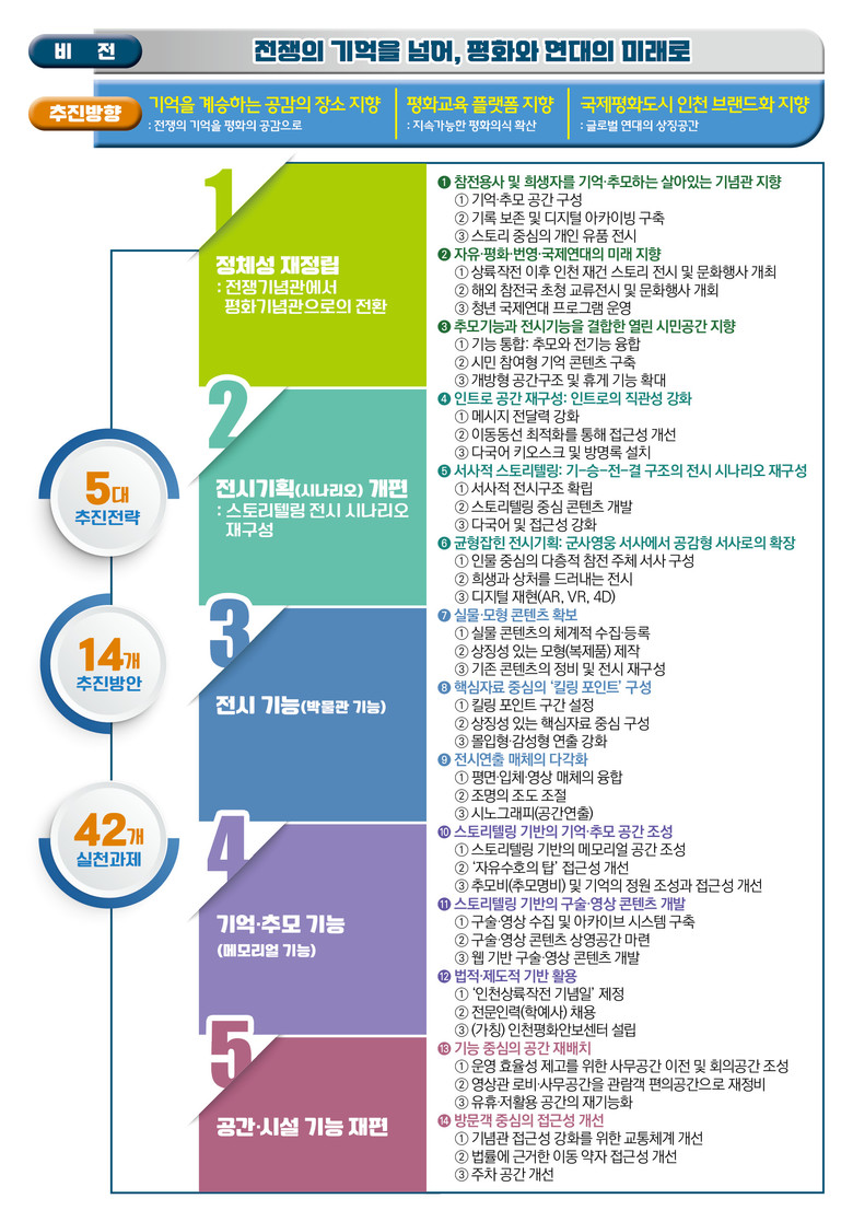 보고서는 기념관 기초조사와 국내외 유사 기념관 사례분석을 토대로 리뉴얼 추진 로드맵을 설계했다. 비전은 “전쟁의 기억을 넘어, 평화와 연대의 미래로” 이며, 이를 실현하기 위한 3대 추진방향으로 ▲기억을 계승하는 공공의 장소 지향 ▲평화교육 플랫폼 지향 ▲국제평화도시 인천 브랜드화 지향을 제시했다. 또 이를 구체화하기 위해 5대 추진전략, 14개 추진방안, 42개 실천과제가 마련됐다.