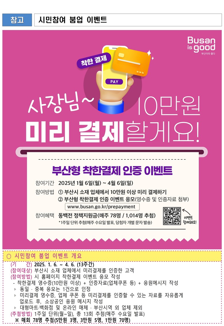 참여를 원하는 시민은 오는 4월 6일까지 부산시 소재 업체에서 10만 원 이상을 미리 결제한 후, 시 누리집(www.busan.go.kr/prepayment)에 결제 영수증과 업체 쿠폰 등 인증 자료를 등록하고 소상공인을 응원하는 메시지를 남기면 된다.