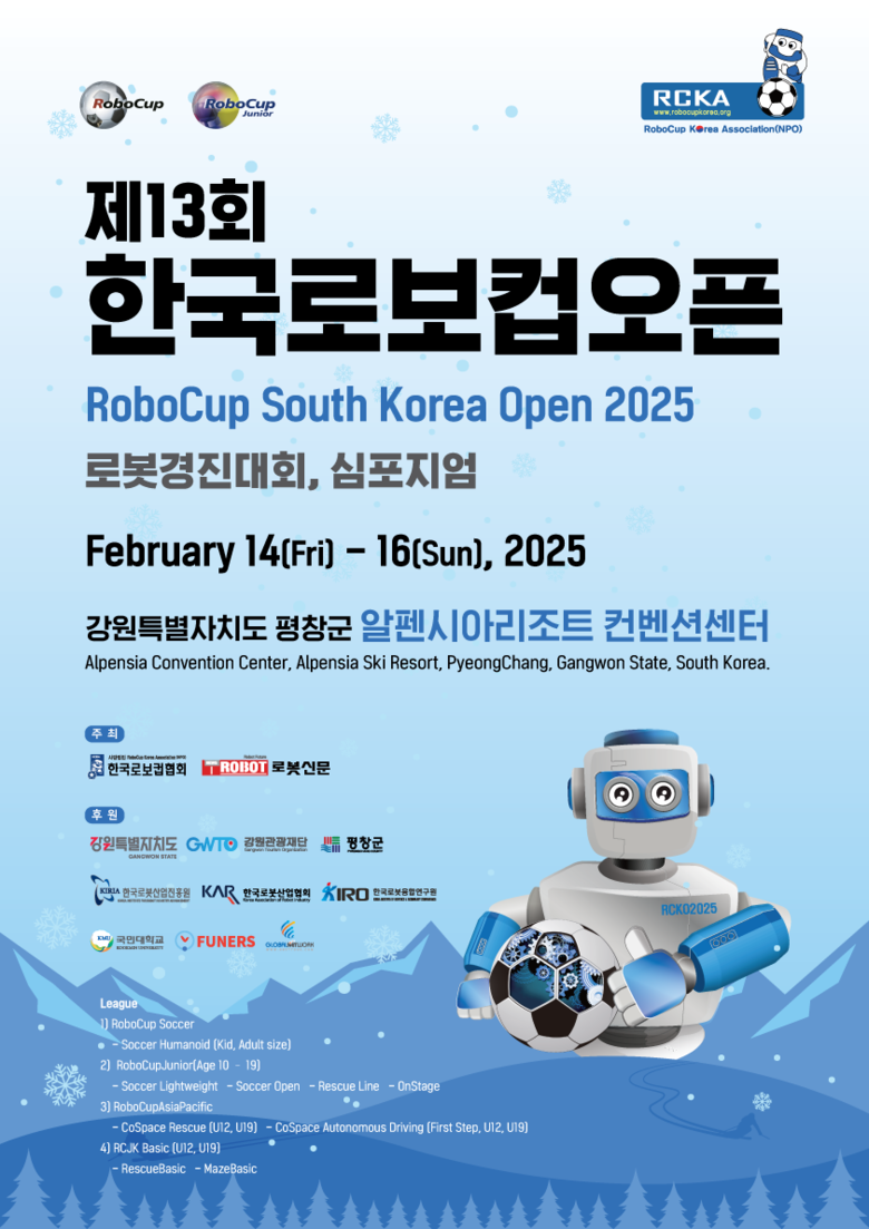 한국로보컵협회와 로봇신문이 주최하고 평창군, 강원관광재단, 산업통상자원부, 한국로봇산업진흥원 등이 후원하는 이번 대회는 2월 14일(금)부터 16일까지 3일간 개최되며 15일(토)에 개막식이 열린다.