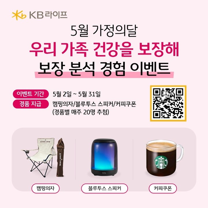 이번 이벤트는 KB라이프생명 홈페이지를 통해 ‘디지털 보장 분석’ 서비스를 이용한 고객을 대상으로 한다. KB라이프생명은 매주 60명을 추첨해 ▲캠핑의자(20명) ▲블루투스 스피커(20명) ▲커피쿠폰(20명)을 경품으로 제공한다.