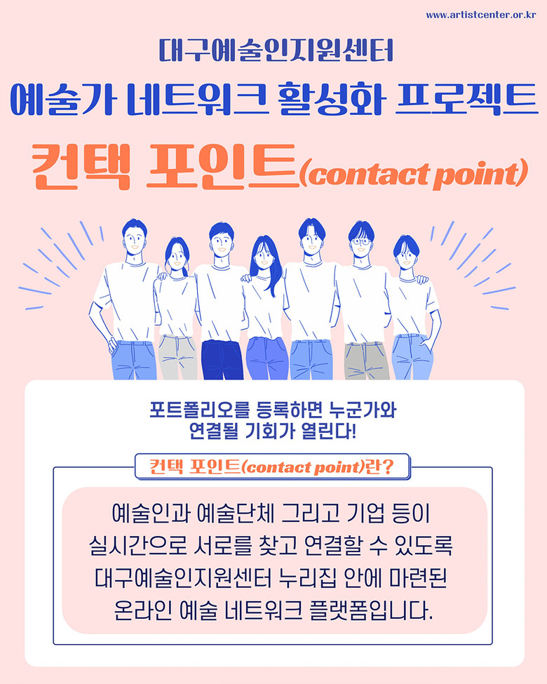 ▸ 예술인 포트폴리오 등록하고 협업 실적 인증하면 상품 증정 [대구 세계타임즈=한윤석 기자] (재)대구문화예술진흥원(원장 박순태, 이하 진흥원)은 지역 예술인의 창작 기반 확장과 상호협업 활성화를 위해 온라인 협업 플랫폼 ‘컨택포인트(contact point)’를 2025년 8월부터 운영한다.