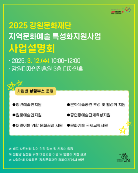 2025년 지역문화예술 특성화지원사업 사업설명회는 3월 12일(수) 오전 10시부터 12시까지 강원디자인진흥원 디자인홀에서 개최된다. 이번 설명회에서는 지원사업 정보 제공 및 개별 상담이 이루어질 예정이다. 사업별 담당자가 직접 상담부스를 운영해 △청년예술인 지원 △원로예술인 지원 △어린이를 위한 문화공연 지원 △문화예술공간 조성 및 활성화 지원 △공연장 예술단체 육성 지원 △문화예술 국제교류 지원의 사업 정보를 안내한다.