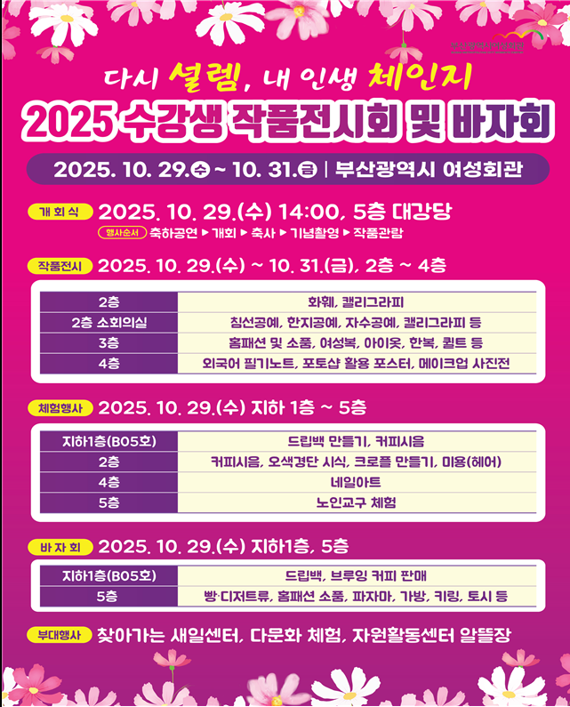 ◈ 행사의 자세한 사항은 여성회관 누리집 공지사항을 참고하면 돼 [부산 세계타임즈=이용우 기자] 부산시 여성회관은 수강생들의 배움의 성취와 경제활동 의욕 고취를 위한 「2025년 수강생 작품전시회 및 바자회」를 오는 10월 29일부터 31일까지 <다시 설렘, 내 인생 체인지>라는 주제로 개최한다고 밝혔다.