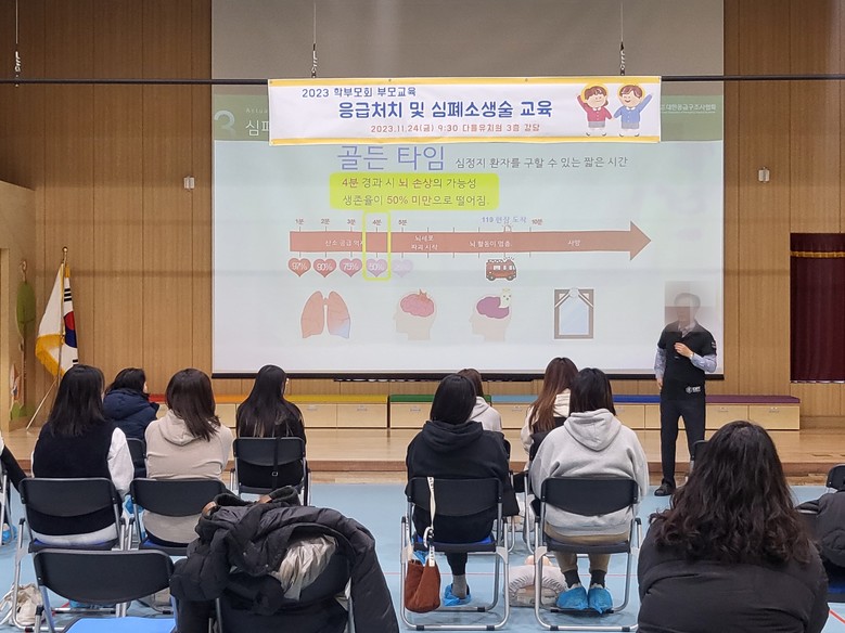 이번 연수는 겨울철 급격히 추워진 날씨와 실·내외 온도 차이로 인해 우리의 신체가 기온 변화에 적응하지 못하여 급성 심정지 발생 위험이 높아지는 점을 고려하여 위급상황 시 안전 대처 능력을 기르고자 학부모회 주관으로 진행됐다.