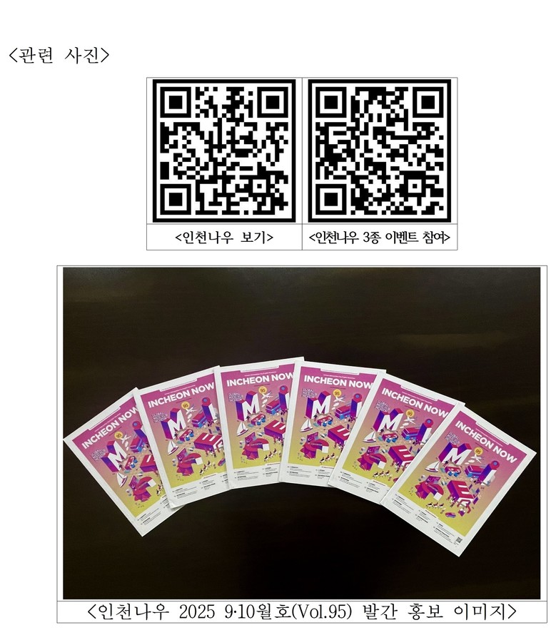 - 글로벌 MICE와 인천상륙작전 기념주간으로 본 국제적 위상과 평화 가치 - [인천 세계타임즈=심하린 기자] 인천광역시(시장 유정복)는 인천시 영문소식지 인천나우(IncheonNow) 창간 15주년을 기념하여 9·10월호(Vol. 95) 발간하고 독자들과 함께하는 참여형 구독 이벤트를 진행한다고 밝혔다.