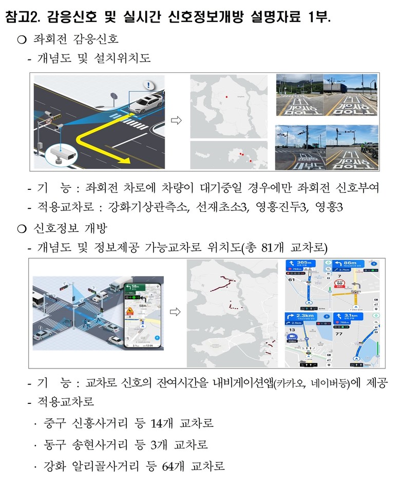 이와 함께 운전자 편의 향상을 위해 강화 64개 교차로, 중구 14개 교차로, 동구 3개 교차로 등 총 81개 교차로를 대상으로 실시간 전방 신호등 잔여 시간 정보를 제공하고 있다. 해당 정보는 카카오내비, 네이버 지도(내비게이션), 티맵, 현대·기아 차량 내비게이션 등을 통해 교차로 진입 시 실시간으로 확인할 수 있다.