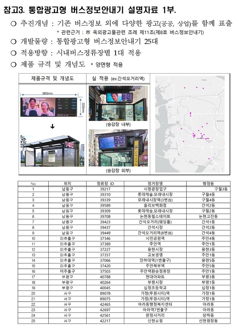 또한 인천시는 기존 시내버스 정류장에 설치된 버스정보안내기에 광고 기능을 결합한 ‘통합광고형 버스정보안내기’ 25대를 시범 개발해 2026년 1월부터 시범 운영할 계획이다. 이는 전국 최초로 시도되는 모델로, 소상공인을 포함한 상업 광고와 다양한 공익 광고를 함께 표출해 시민과 소통하는 지역 커뮤니티 시설물로 활용한다는 구상이다.