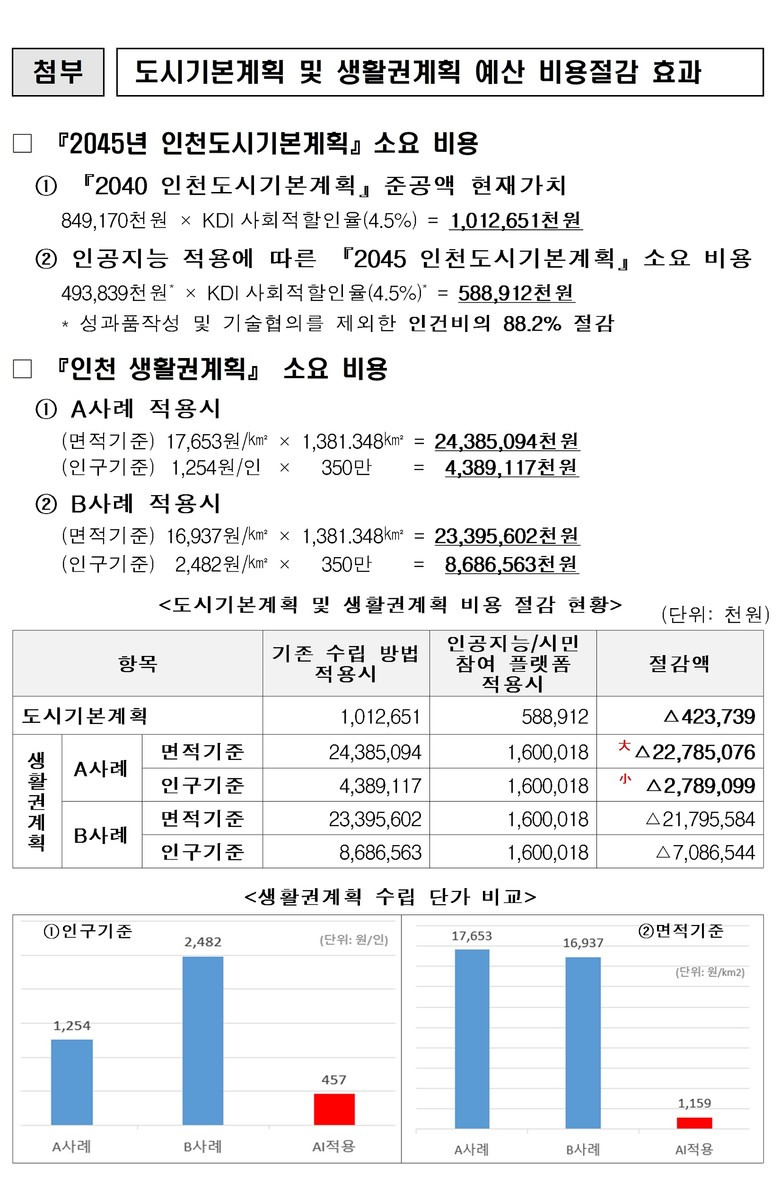 - 계획 수립 시간 93.5% 단축, 비용 88.2% 절감 성과 - [인천 세계타임즈=심하린 기자] 인천광역시(시장 유정복)는 국내 최초로 인공지능(AI)을 활용해 도시기본계획을 ‘이슈 중심의 전략계획’ 형식으로 수립하여 시민이 쉽게 이해할 수 있는 소통형 도시계획의 새로운 전환점을 마련했다고 밝혔다.