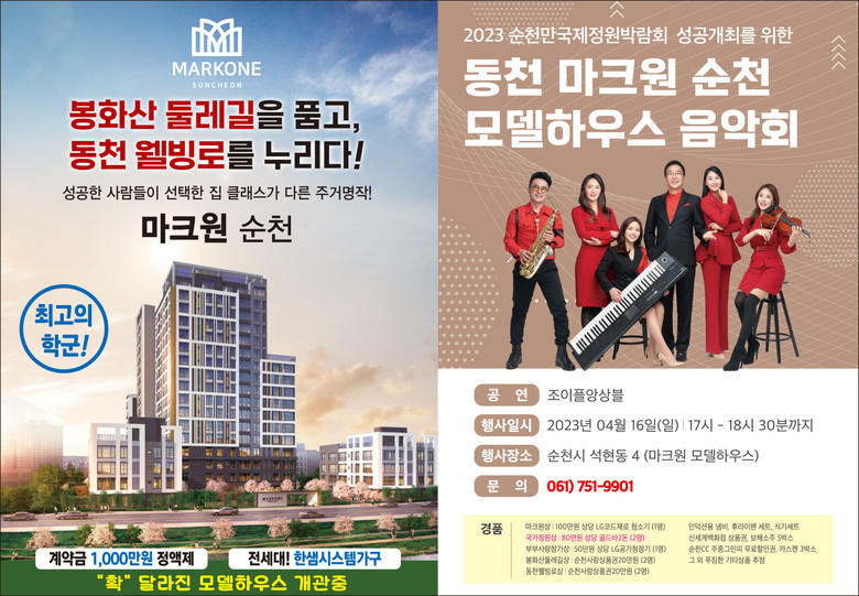 [세계타임즈 = 양준호 기자]제이엠에셋이 시행하고 중우건설이 시공하는 아파트 '마크원 순천'이 순천 정원박람회 성공 기원과 모델하우스 개관 기념 음악회를 개최한다고 11일 밝혔다.