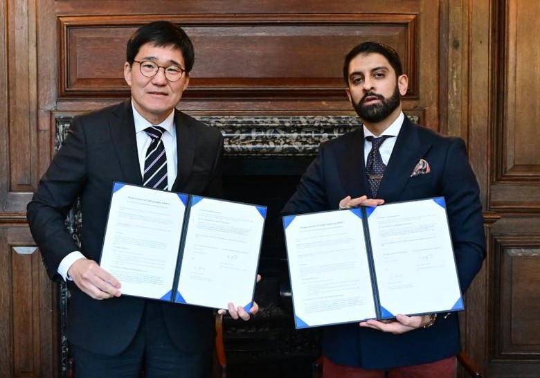 | ▲ 25일(현지시간) 영국 케임브리지대학교에서 박성진 인천경제청 투자유치사업본부장(왼쪽)과 오스만 마지드 살로니카 대표가 업무협약을 체결하고 있다 |