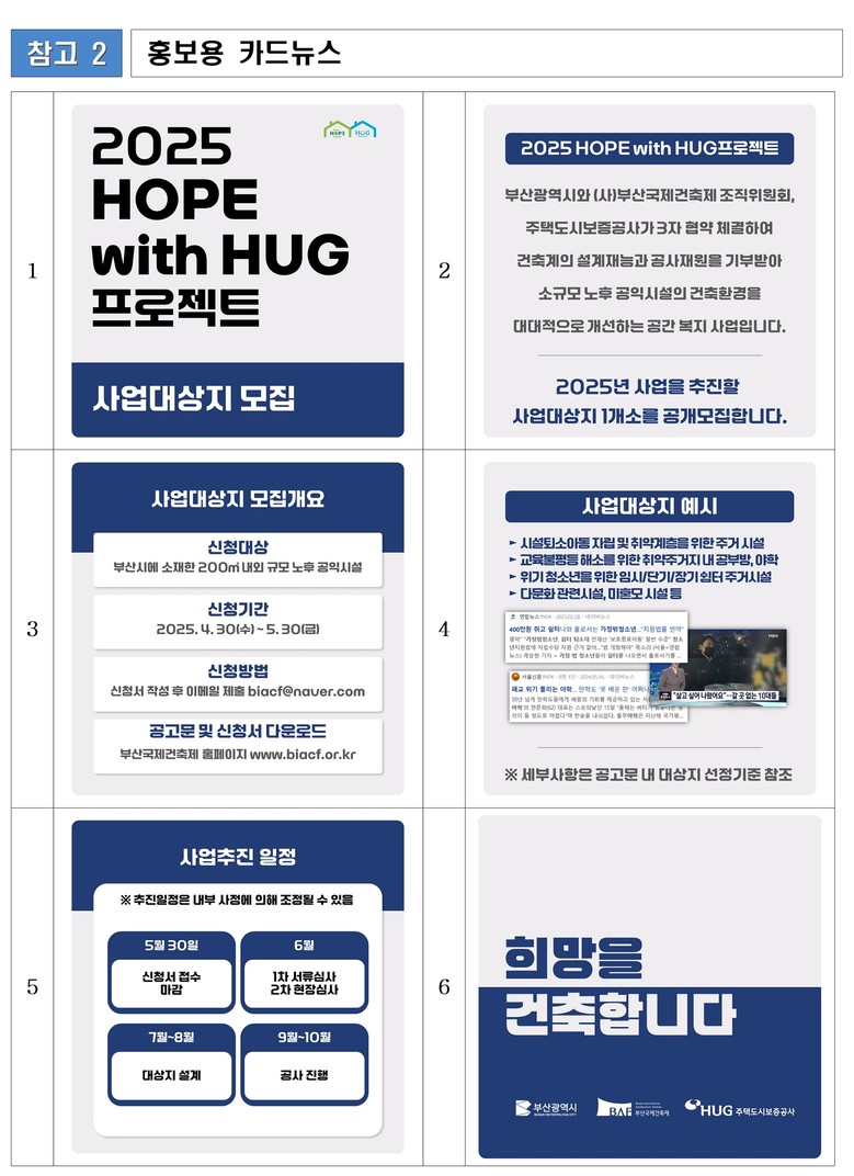 ◈ 5.30.까지 신청할 수 있으며, 자세한 내용은 부산국제건축제 공식 누리집(www.biacf.or.kr)에서 확인할 수 있어 [부산 세계타임즈=이용우 기자] 부산시(시장 박형준)는 (사)부산국제건축제조직위원회(집행위원장 이성호, 이하 '부산국제건축제'), 주택도시보증공사(HUG, 사장 유병태)와 함께 추진 중인 'HOPE with HUG 프로젝트(이하 'HOPE 사업')'의 올해 사업 대상지를 공개 모집한다고 밝혔다.