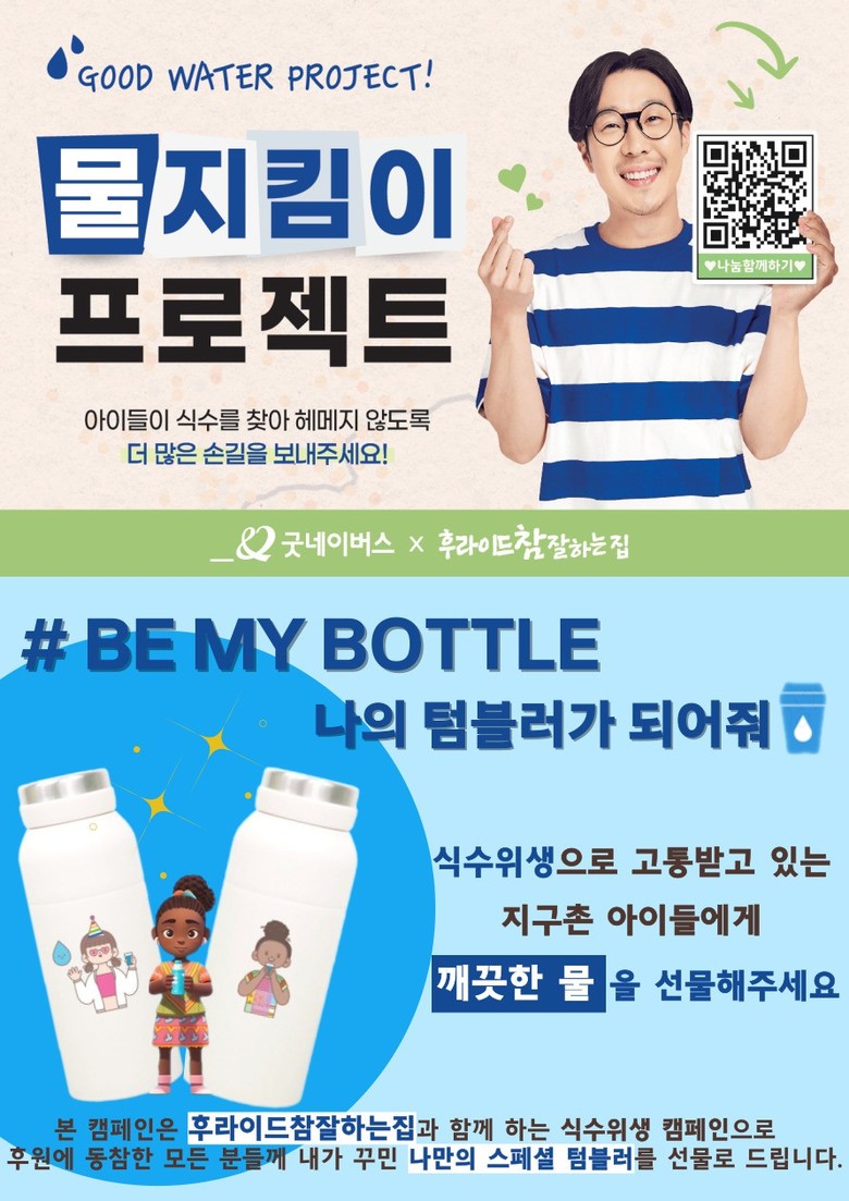 이병현 후라이드참잘하는집 대표는 “BE MY BOTTLE 물지킴이 캠페인을 사람들에게 알리고, 더많은 아이들이 안심하고 안전한 식수 시설을 사용 할 수 있도록 앞장서겠다.”라며 “전 세계 곳곳의 도움이 필요한 곳이라면 어디든 굿네이버스와 함께 따뜻한 세상을 향해 발맞춰 나갈 수 있도록 노려하겠다”라고 전했다.
