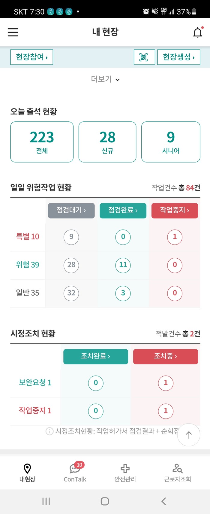 안심은 크게 ▲나의현장 ▲근로자이력 ▲작업허가서 ▲안심톡 ▲위험성평가 ▲안전신문고 등 6가지 서비스를 제공한다. 앱을 통해 현장의 모든 근로자가 당일 작업의 위험도, 팀원 현황, 안전수칙 등 주요 점검사항을 확인할 수 있다.