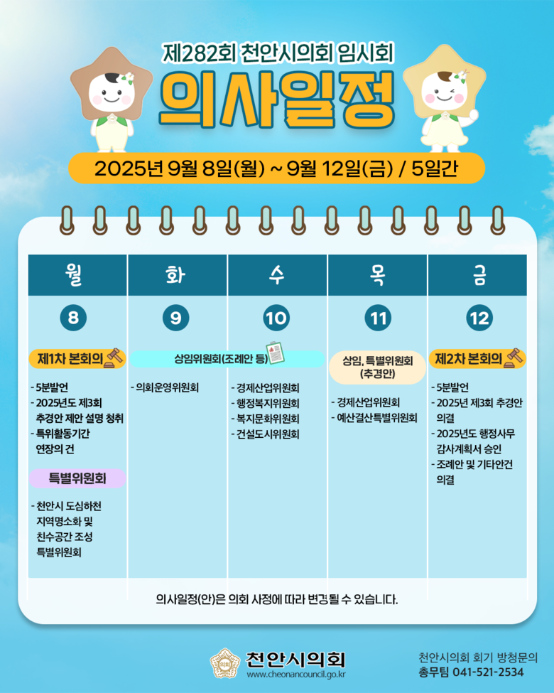 이번 제282회 임시회에서는 5분 발언 ▲천안시 차량 안심번호 활성화 방안에 대한 제언(이지원) ▲천안시 청년 후계농의 지원 제도 개선(김철환) ▲천안시 동남구 지역 청소년문화의집 설립 촉구(박종갑) ▲천안시의 국가유공자 고독사 예방을 위한 제언(유영진) ▲반복되는 천안의 아픔, 촉법소년 문제 해결을 위한 제언(김길자) ▲국립치의학연구원 천안 설립 촉구(장혁) ▲천안시 상업지역 저녁시간대 주정차 단속 유예제 도입 촉구(유수희)▲복지 신청주의의 문제와 자동지급 원칙의 필요성(배성민)을 통해 시정 현안에 대해 대안을 제시할 계획이다.