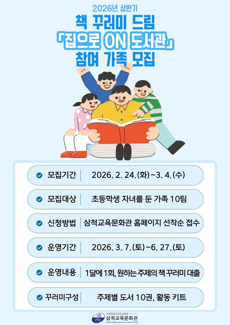 2월 24일(화)부터 3월 4일(수)까지 선착순 10가족을 모집하며, 삼척교육문화관 누리집에서 신청할 수 있다.