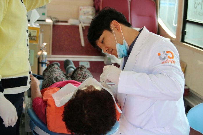 | ▲ 진세식 유디치과(강남역점) 대표원장이 어르신의 치아를 검진 하고 있는 모습 |