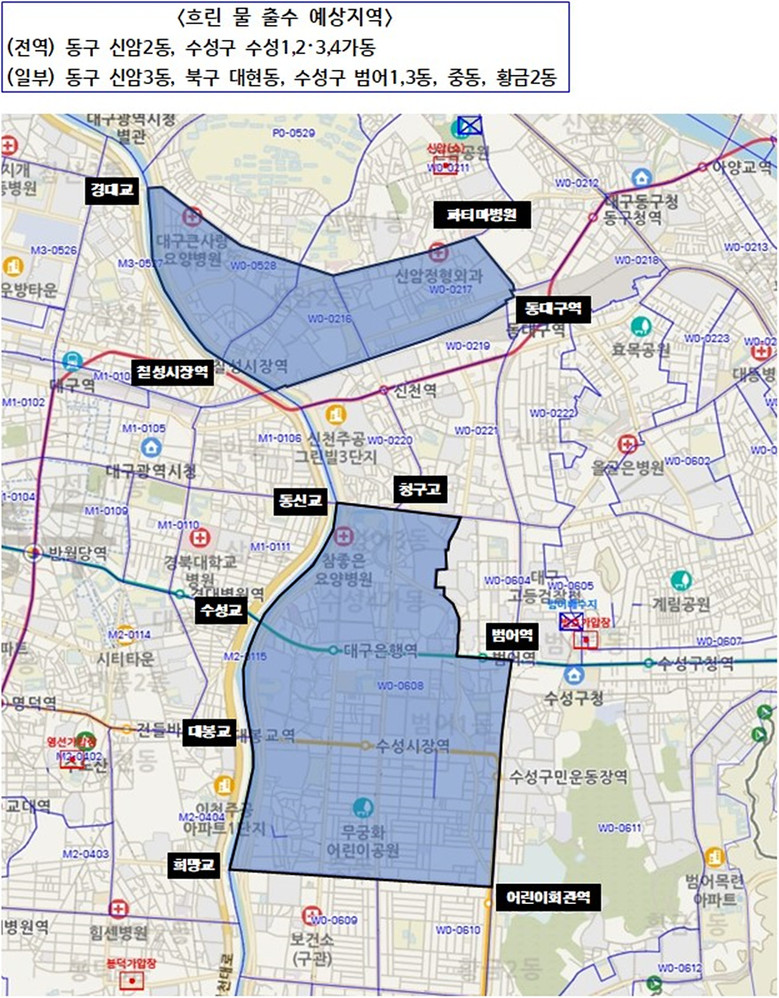 이번 수계조정으로 6월 25일(수) 22시부터 다음날 06시까지 동구 신암2동, 수성구 수성1,2·3,4가동 전역 및 동구 신암3동, 북구 대현동, 수성구 범어1,3동, 중동, 황금2동 일부 지역 3만 3천 세대에서 흐린 물이 나올 수 있다.
