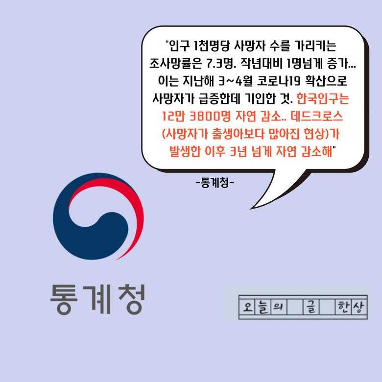 통계청은 “인구 1천명당 사망자 수를 가리키는 조사망률이 작년대비 1명 올라갔고. 이는 지난해 3~4월 코로나19 확산으로 사망자가 급증한 데 기인했다.” 고 설명했다.