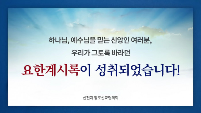 이어 “이러한 저희에게 요한계시록이 이뤄졌다는 소식은 그 어떤 소식보다 기쁘고 복된 소식이었다”며 “그리고 이것은 모든 신앙인들이 간절히 바라 온 소식”이라고 말했다.