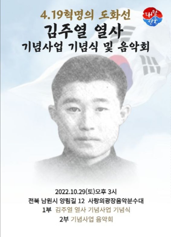 [세계타임즈 백진욱 기자] 김주열 열사를 기리는 제1회 김주열 열사 기념사업 기념식 · 음악회가 2022년 10월 29일 (토) 오후3시 전북 남원시 양림길 사랑의 광장음악분수대에서 열린다.