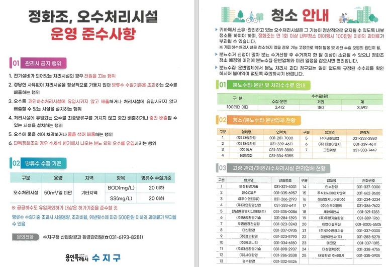 이번 안내문에는 시민들이 꼭 알아야 할 ▲정화조 관리 시 주의사항 ▲정화조·분뇨 청소 요금 기준 ▲허가받은 청소·수거 업체 현황 ▲방류수 수질 기준과 관리 요령 등이 담겼다.