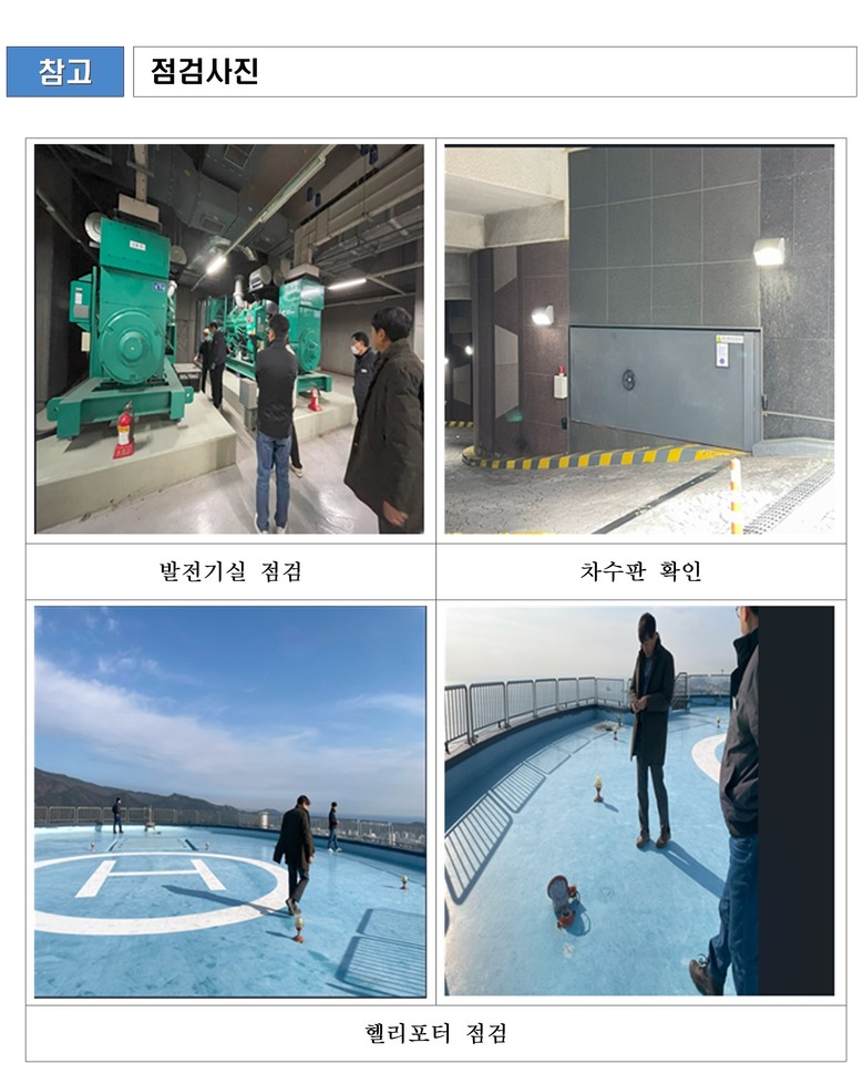 * 시정보완 4건: 초기대응대 훈련 미비, 재난 및 테러훈련 미비, 종합 상황실 지진계 보수, 헬리포터 계단 난간 보수