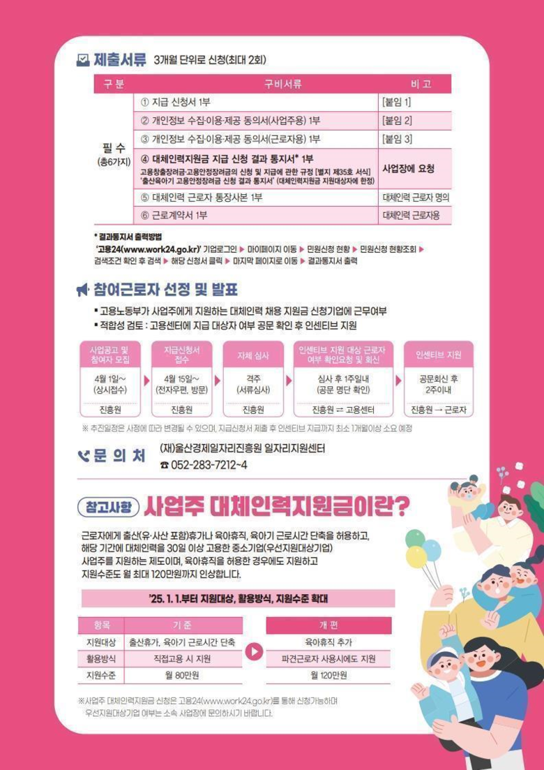 이 사업은 울산 소재 중소기업에 채용된 육아휴직 대체인력 근로자가 일정 기간 이상 지속해 근무할 경우 1인당 최대 200만 원의 특전(인센티브)을 지원하는 사업이다.