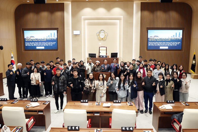 [수원시 세계타임즈=송민수 기자] 수원특례시의회(의장 이재식)는 1월 30일(금), 베트남 하노이 응우옌후에 고등학교와 25-10 고등학교 학생 50여 명과 학부모들이 참여한 의회 견학 프로그램을 진행했다.