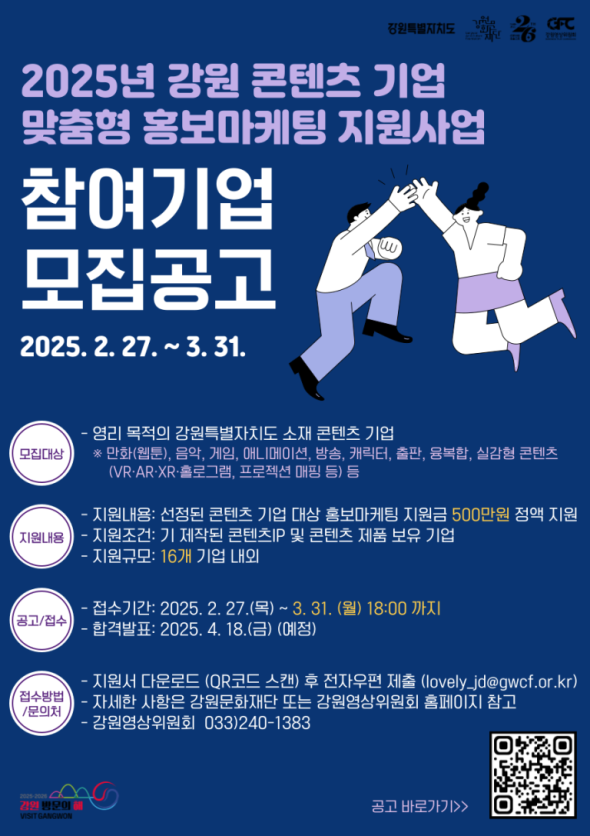 ‘2025년 강원 콘텐츠 기업 맞춤형 홍보마케팅 지원 사업’은 도내 우수 콘텐츠 기업을 대상으로 국내·외 유통 판로 개척 및 안정적인 시장 진출을 돕기 위해 기업의 홍보마케팅 비용을 지원하는 사업이다.