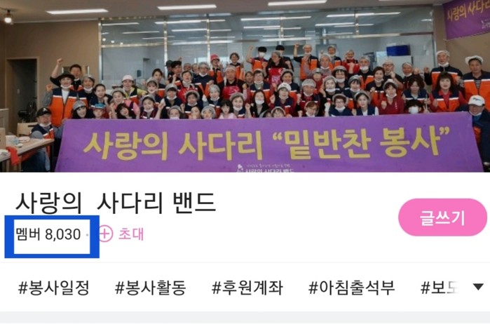 [세계타임즈 이장성 기자] 다양한 봉사를 꾸준히 실천하고 있는 SNS 대전시 봉사단체 사랑의 사다리 밴드(리더 이정제)는 지난3일 밴드개설 33개월 만에 8천명 회원가입을 대기록을 세우면서 지역봉사의 새로운 역사를 쓰고 있어 화제가 되고 있다.