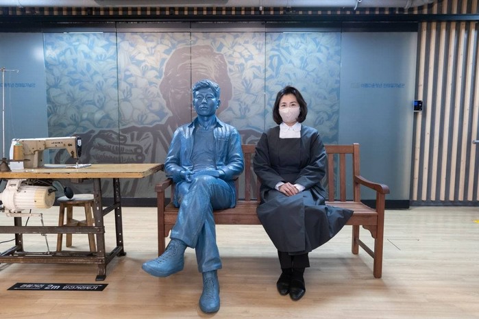 ‘2021 이소선 10주기 특별기획전’도 관람하고, 생전 어머님이 자주 입으시던 옷을 본따 만든 조형물에도 추모 메시지를 남겼다.