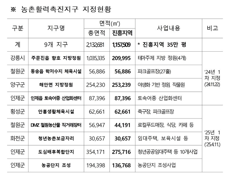 한편, 농지특례 제도인 농촌활력촉진지구는 지금까지 두 차례 지구 지정을 통해 6개 시군에 9개지구에 약 116ha(약 35만평)을 지정하였다.