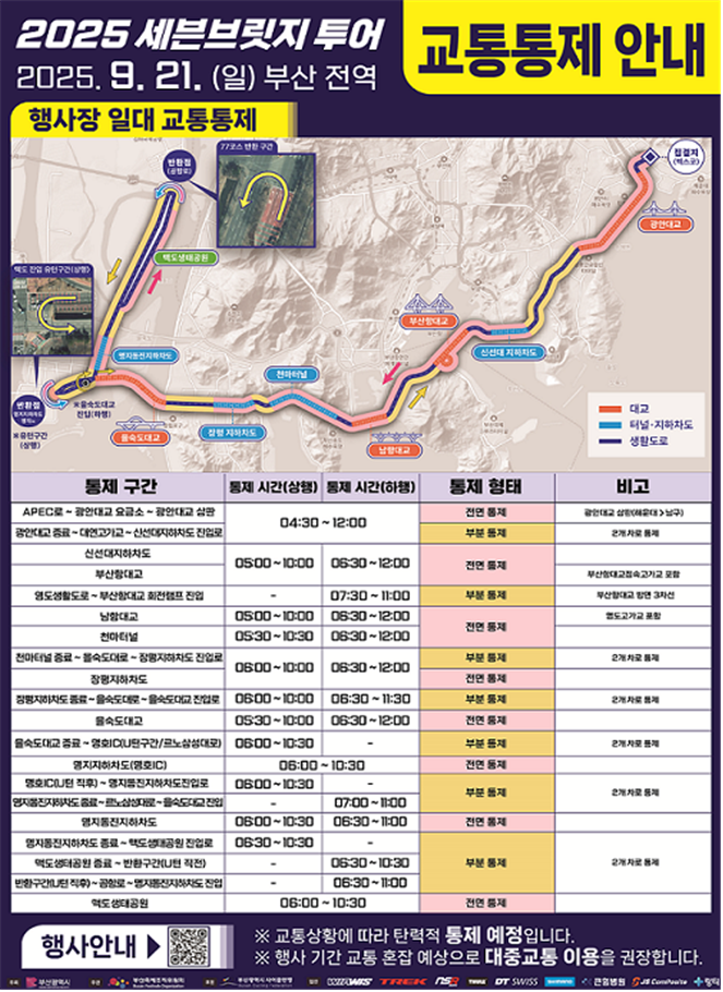 ▲화물차 ▲영업용 차량 ▲대중교통 이용 시민의 불편을 최소화하기 위해 사전 홍보와 현장 안내를 강화하며, 구체적인 교통 통제 내용은 시 누리집(busan.go.kr) 또는 행사 공식 누리집(busan7bridges.com) 및 인스타그램(@busan7bridges)에서 확인 할 수 있다.