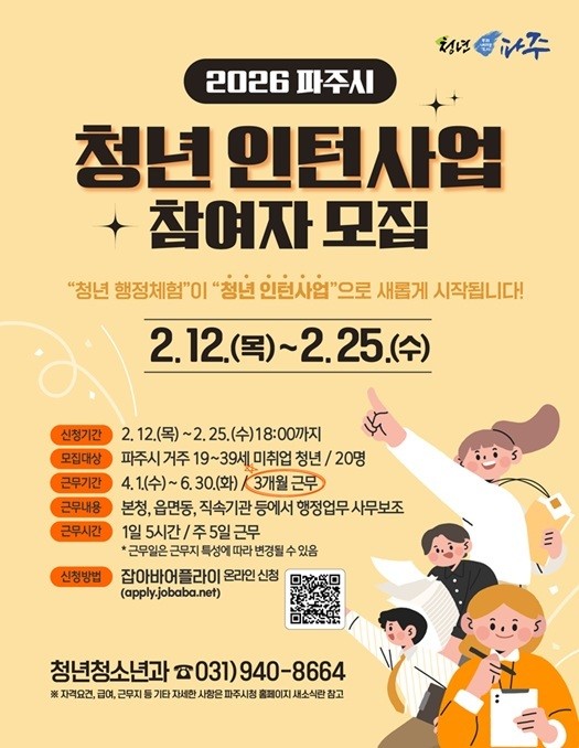 한편, ‘파주시 청년 인턴사업’ 참여자 모집 기간은 2월 12일부터 25일까지이며, 경기도 일자리지원사업 통합접수시스템 ‘잡아바어플라이’(apply.jobaba.net) 누리집을 통해 온라인으로 신청이 가능하다. 시는 서류와 면접 심사를 거쳐 3월 24일 최종 합격자를 발표할 예정이다.