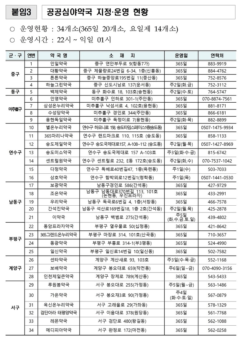 * 공공심야약국 : 밤 10시부터 새벽 1시까지 운영, 약 구입 및 복약 상담 제공