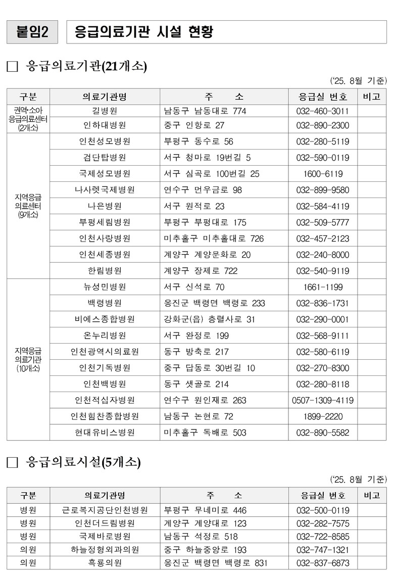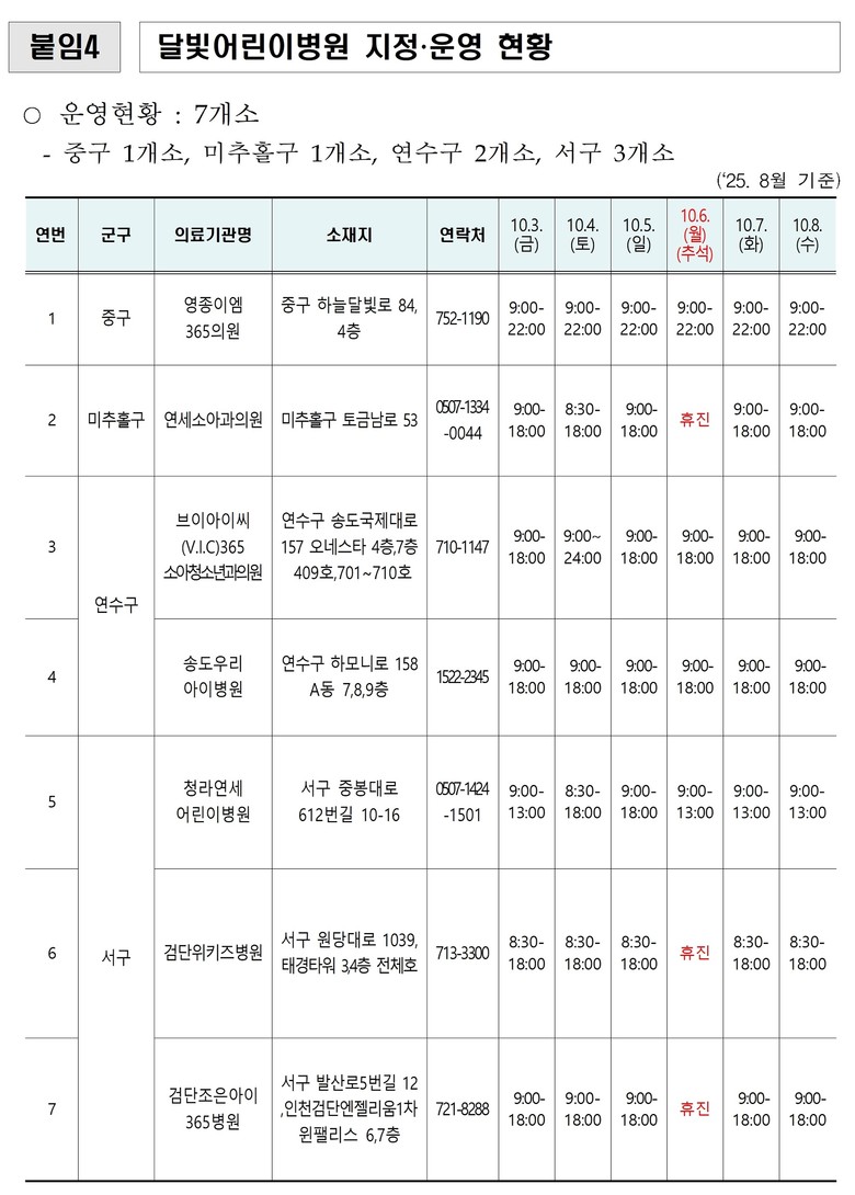 연휴 기간 문을 여는 병의원 및 약국 정보는 응급의료포털 ‘e-gen’, 인천시청 및 각 군·구 홈페이지를 통해 확인할 수 있으며, 120 미추홀콜센터, 119 구급상황관리센터, 129 보건복지상담센터를 통해서도 안내받을 수 있다.
